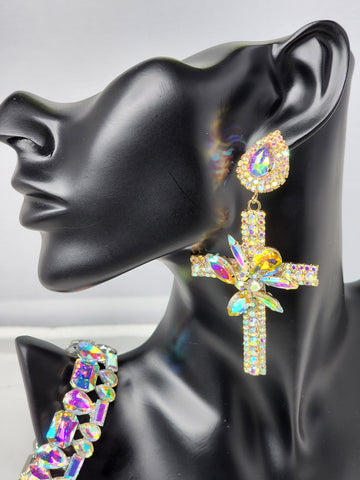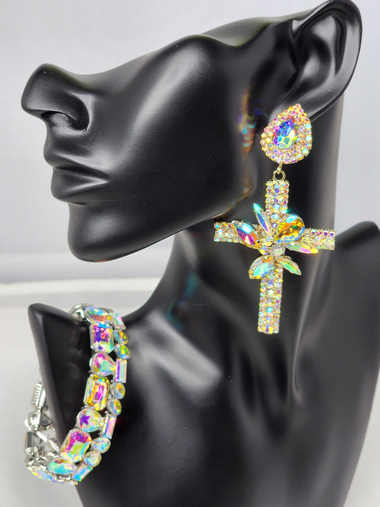 LARGE IRIDESCENT STONE EARRINGS AND BRACELET SET